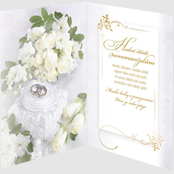 Text uvnitř: Hodně štěstí novomanželům. Buďte šťastni v každé době, rájem Vám buď celý svět. Co dnes slíbili jste sobě, nechtějte vzít nikdy zpět! Mnoho lásky a porozumění Vám ze srdce přeje