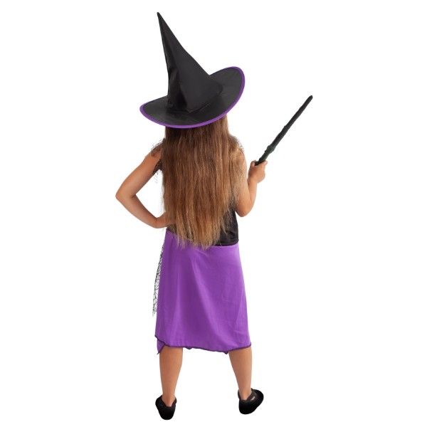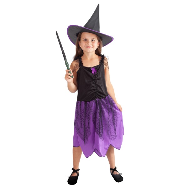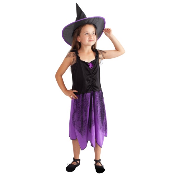 Kostým černo-fialové barvy ve velikosti S je určen pro holčičky ve věkovém rozmezí 3-6 let (105-116 cm).