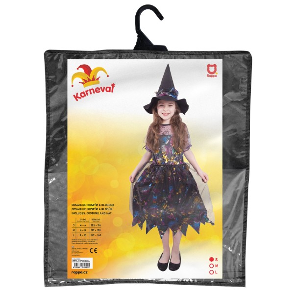 Šaty jsou zdobené barevnými halloweenskými motivy. Součástí balení je perfektně sladěný klobouk.