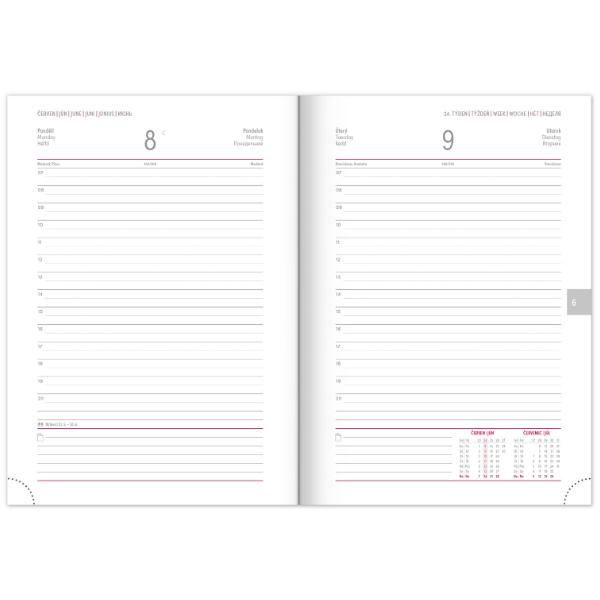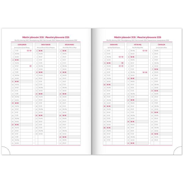 Kolekce vsadila na osvědčené barvy, které doplňuje nová ražba letopočtu. Denní rozvrh s česko-slovenským kalendáriem a doplňkovou angličtinou, němčinou, maďarštinou a ruštinou.