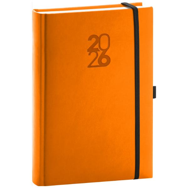 Denní diář Aprint 2026 v oranžové barvě s gumičkou a poutkem na pero.