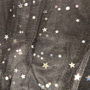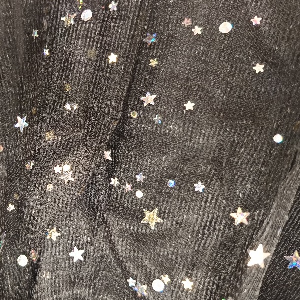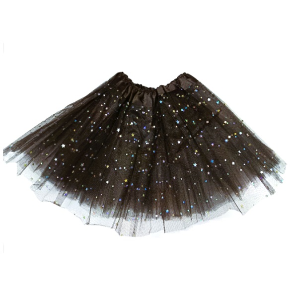 Sukýnka je třívrstvá, má černou spodničku, překrytou tylem potištěným stříbrnými třpytkami a hvězdičkami.