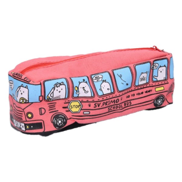 Školní pouzdro s potiskem autobusu, do kterého si poskládá školák všechny potřebné věci.