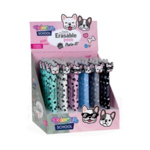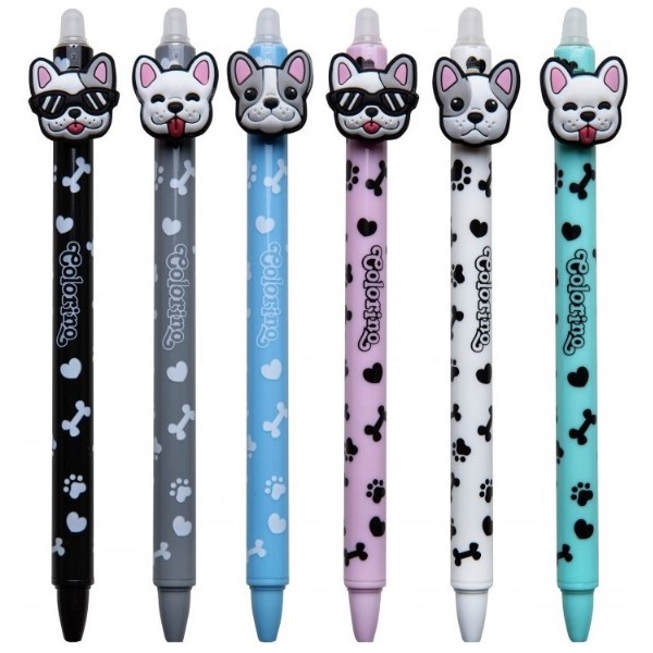 Gumovací pero Colorino. Oblíbená praktická pera se stiskací mechanikou pro školáky – psaní textu bez přepisování. Stačí vygumovat napsaný text a snadno napsat nový. Motivy roztomilých buldočků v barevném mixu.