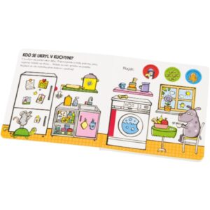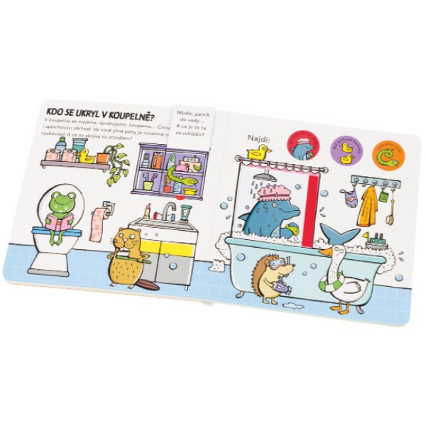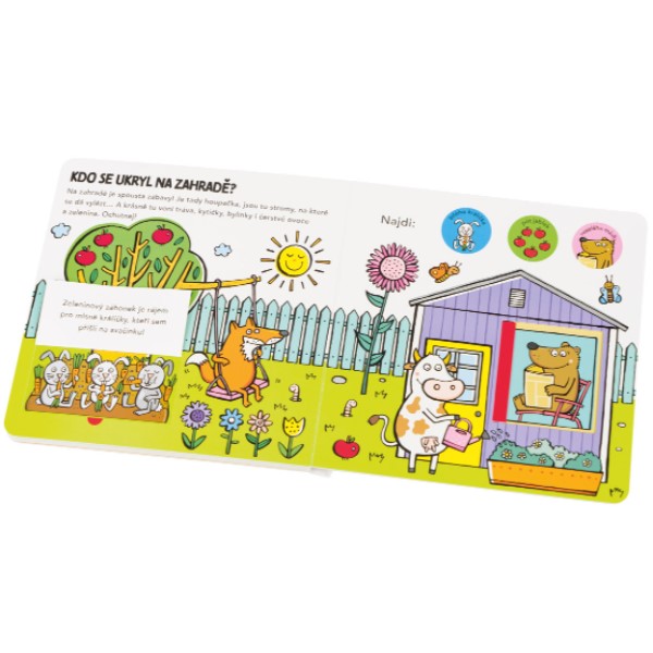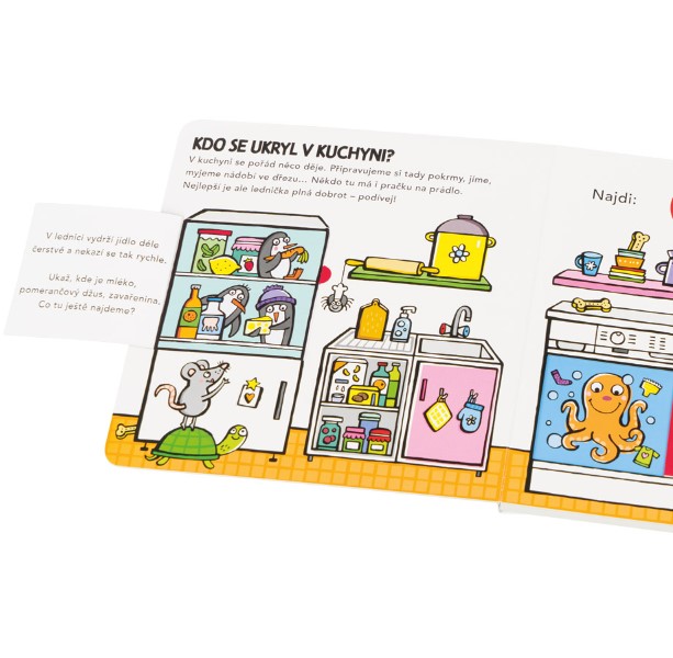 Oblíbený formát leporela s odklápěcími chlopněmi a posuvnými dvířky poskytuje malým čtenářům chytrou zábavu a zároveň utváří jejich představu o tom, jak to vypadá v jednotlivých místnostech v domě a k čemu tyto místnosti obvykle slouží. Práce s takovouto knihou přispívá rovněž ke zlepšování koordinace ruka – oko. Děti tu objevují zvířátka ukrytá v kuchyni, v obývacím pokoji, v pokojíku, v koupelně či na zahrádce a řeší jednoduché úkoly zaměřené na rozvoj pozornosti a základních matematických představ.
