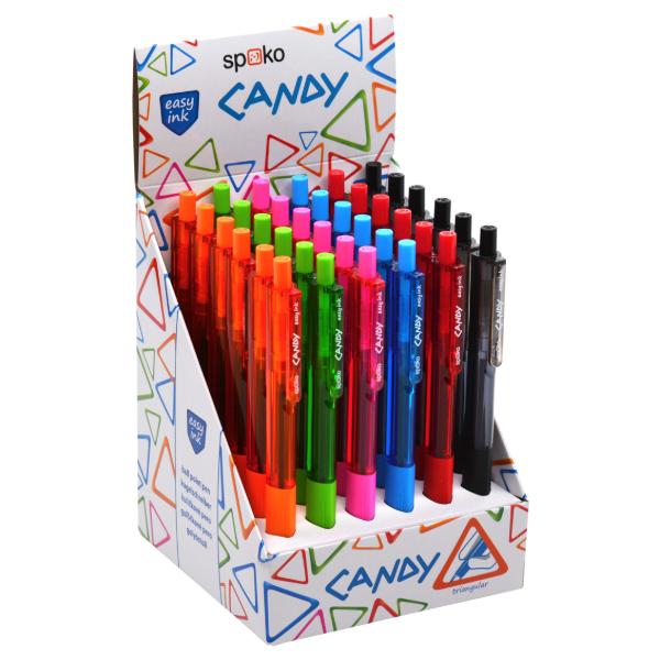 Kuličkové pero řady CANDY s příjemným trojhranným úchopem pro komfortní držení a psaní. Stiskací mechanika.