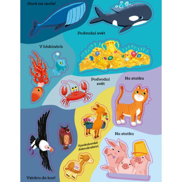 Dolepujte celostránkové obrázky velkými samolepkami pro malé ručičky a naučte se znát nejrůznější druhy živočichů.