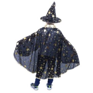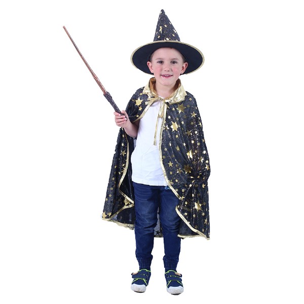 Balení obsahuje čarodějnický plášť černé barvy se zlatým lemováním a hvězdami a perfektně sladěný klobouk. V těchto exkluzivních doplňcích tě zaručeně nikdo nepřehlédne!
