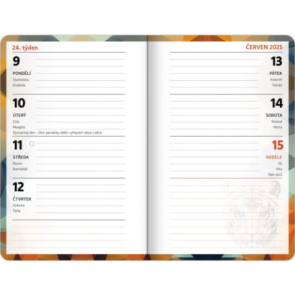 Obsahuje: přehled na rok 2024 a 2025, české týdenní řádkové kalendárium, seznam jmen, seznam svátků, taháky z češtiny, matematiky, angličtiny, fyziky, 2 x rozvrh hodin, prostor na poznámky