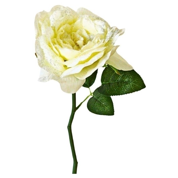 Elegantní umělá květina imitující růži v klasické bílé barvě s glitry krásně doladí sváteční atmosféru.