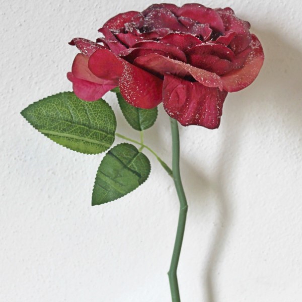 Elegantní umělá květina imitující růži v bordó barvě s glitry krásně doladí sváteční atmosféru.