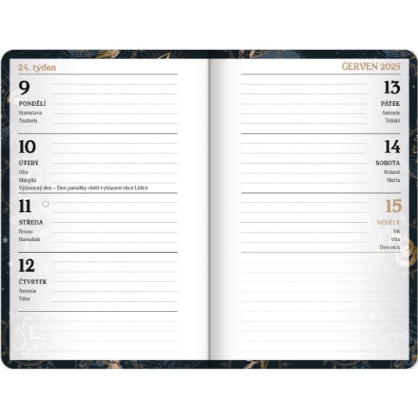 Obsahuje: přehled na rok 2024 a 2025, české týdenní řádkové kalendárium, seznam jmen, seznam svátků, taháky z češtiny, matematiky, angličtiny, fyziky, 2 x rozvrh hodin, prostor na poznámky
