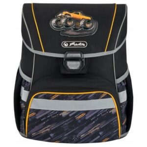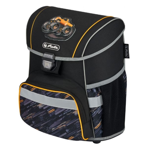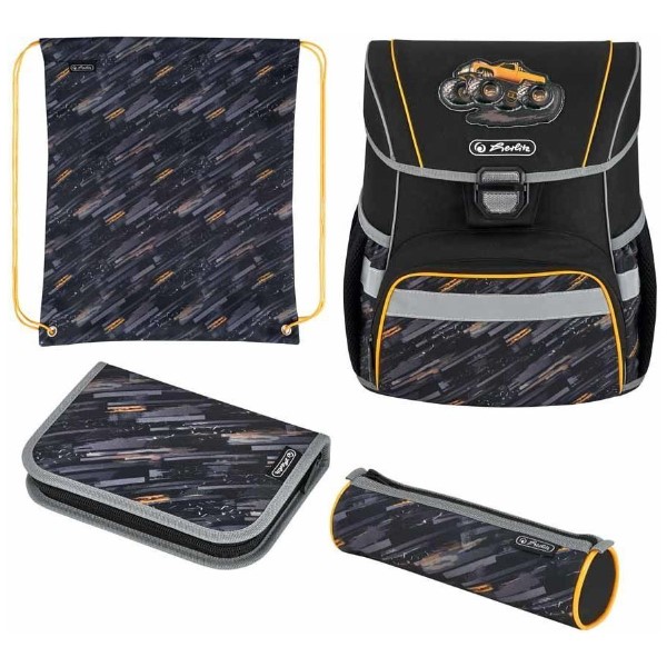 Školní set obsahuje aktovku Loop Plus s nízkou hmotností cca 950 g, sáček na cvičky, plný penál a pouzdro, to vše v designu Monster Truck – Náklaďák.