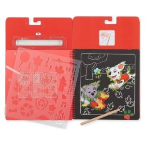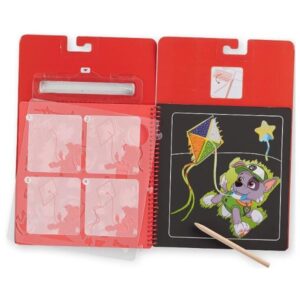 Obsahuje: 10 škrabacích obrázků s kroužkovou vazbou, dřevěná tužka se špičkou na vyškrabávání, šablony na obkreslení a samolepky