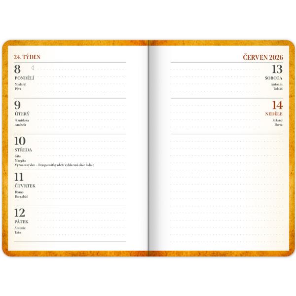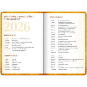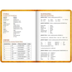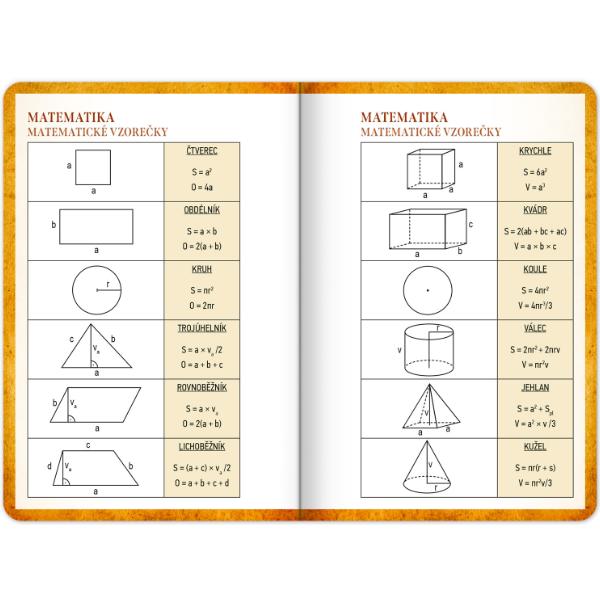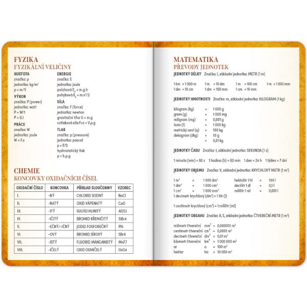Studentský diář obsahuje: přehled na rok 2025 a 2026, abecední seznam jmen, české týdenní řádkové kalendárium se jmény a svátky, 2x rozvrh hodin, prostor na poznámky a základní poznatky z matematiky, fyziky, chemie a angličtiny pro studenty.