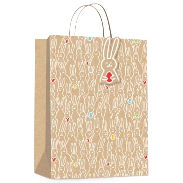 Stylová papírová taška se štítkem ve tvaru vejce v přírodní hnědé barvě.