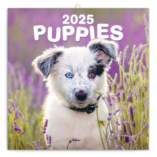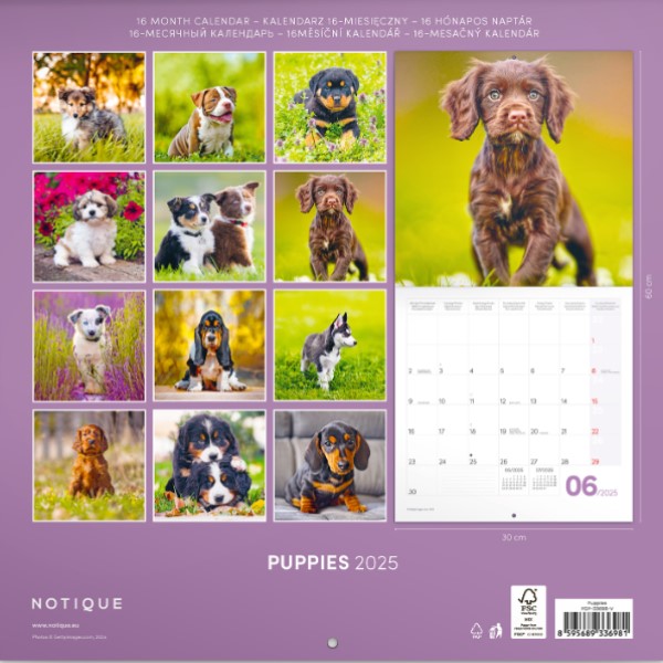 Roztomilá štěňátka na fotografiích v poznámkovém kalendáři s šestijazyčným kalendáriem.