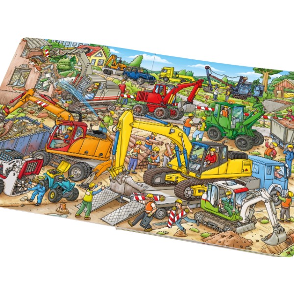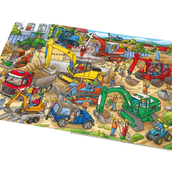 Tohle velkoformátové obrázkové leporelo ocení především fanoušci náklaďáků, bagrů, rypadel a dalších stojů, které pomáhají všude tam, kde se vzniká něco nového. Červený bagr s dvojitými pneumatikami, zelený kolový nakladač, oranžový minibagr, žluté pásové rypadlo… rozmanitá technika vykonává ty nejnáročnější práce. A pak je tu třeba spousty lidí, kteří umějí práci strojů naplánovat, a také těch, kdo je dokážou obsluhovat! Když se budete dobře dívat, objevíte některé stroje a hrdiny na každé stránce, a můžete tak sledovat jejich příběhy.