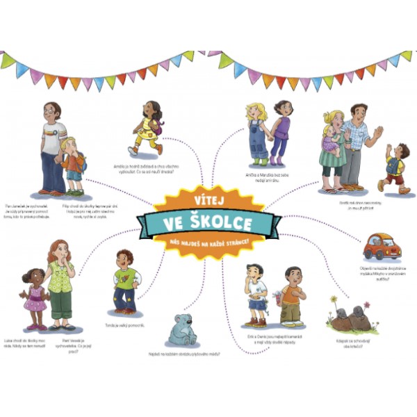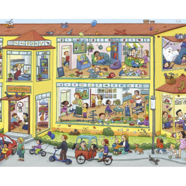 Vítejte v mateřské školce. Hrajeme si tu, učíme se, tvoříme, běháme venku nebo třeba jezdíme na výlety – zkrátka se nikdy nenudíme. Dobře si prohlédněte všechny obrázky, až do těch nejmenších detailů, a bavte se s námi!
