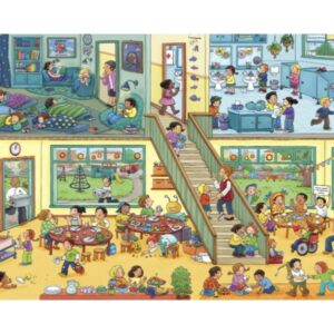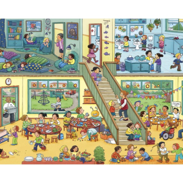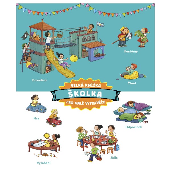 S touhle velkou obrázkovou knížkou prožijete úžasný den v mateřské školce, kde je pořád živo! Ráno sem děti doprovodí maminky a tatínkové a pak teprve začne ta pravá zábava! Někdo si hraje, někdo tvoří, jiní se učí, zpívají nebo třeba cvičí. A pak všichni hurá ven – i tam totiž čeká spousta dobrodružství… Co takhle krátký výlet za zvířátky na farmu? Zapomenout nesmíme ani na povinnosti: pěkně se společně najíst, umýt a jít si po obědě zdřímnout. Zítra se pak můžeme těšit na další setkání s kamarády. I malí čtenáři mohou prožívat školková dobrodružství znovu a znovu – stačí otevřít knížku a začít listovat od začátku!