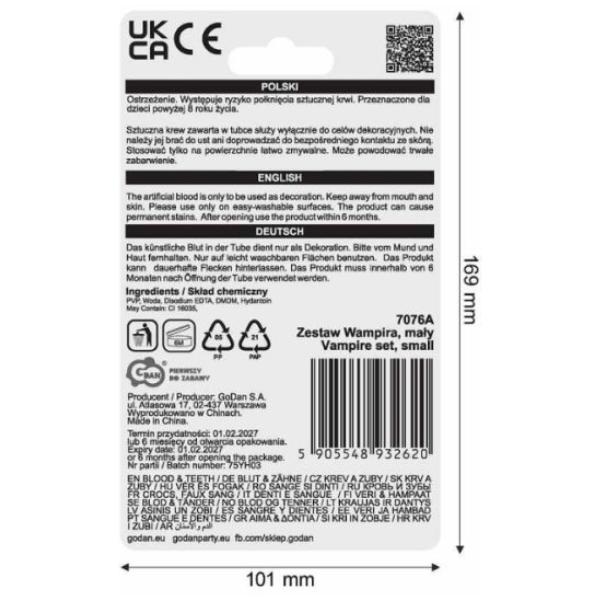 Umělá krev ve zkumavce slouží pouze k dekorativním účelům. Neměla by se brát do úst ani přicházet do přímého kontaktu s kůží. Nanášejte pouze na snadno omyvatelné povrchy. Může způsobit trvalé zabarvení. Po otevření výrobek spotřebujte do 6 měsíců.